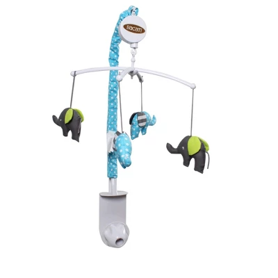 - This Bacati 10-piece Crib Set Includes Reversible Comforter/Playmat (33 x 43 inches), Two Crib fitted sheets (52 x 28 x 6 inches), Crib Skirt/Dust ruffle (13 inch drop) Diaper Stacker (holds more than 30 newborn diapers), Window Valance (15 h x 56 w inches with 1.75 inch Rod Pocket), 3 pc Wall Hangings Set and Musical Mobile in fun, colorful and signature prints in 100 percent cotton 200 Thread Count percale fabrics. Designed in United States by Experienced Designers. Many coordinating items available to purchase separately in this Bacati Elephants Aqua/Lime/Gray Bedding Collection.