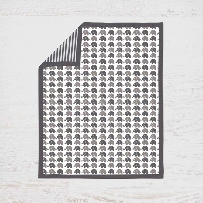 - This Bacati 4-piece Crib Set Includes Reversible Comforter/Playmat (33 x 43 inches), Crib fitted sheet (52 x 28 x 6 inches), Crib Skirt/Dust ruffle (13 inch drop) and Diaper Stacker (holds more than 30 newborn diapers) in fun, colorful and signature prints in 100 percent cotton 200 Thread Count percale fabrics. Designed in United States by Experienced Designers. Many coordinating items available to purchase separately in this Bacati Elephants White/Gray Bedding Collection.