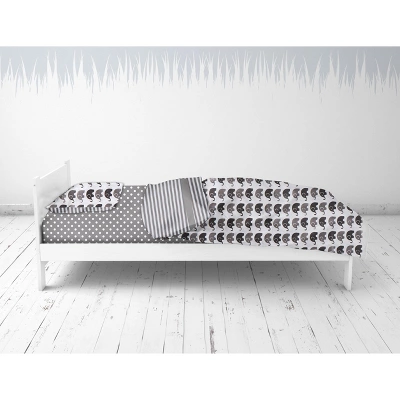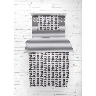 - This Bacati 4-piece Toddler Bedding Set Set Includes Reversible Oversize Comforter (42 x 55 inches), Toddler Bed Fitted Sheet(52 x 28 x 6 inches), Toddler Bed Flat Sheet(52 x 42 inches) which is fitted at the bottom to make the bed easily and Standard Pillow Case (20 x 25 inches) with french ties on the back in fun, colorful and signature prints in 100 percent cotton 200 Thread Count percale fabrics. Designed in United States by Experienced Designers. Many coordinating items available to purchase separately in this Bacati Elephants White Gray Bedding Collection.