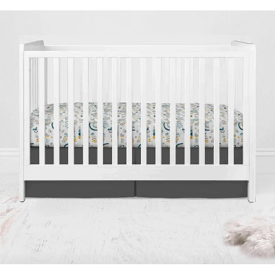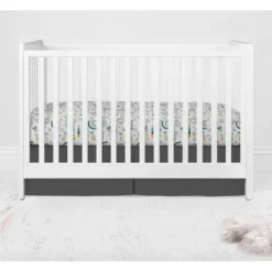 - This Bacati 8-piece Crib Set Includes Reversible 4 layered muslin lux blanket/Playmat (33 x 43 inches), Two Muslin Crib fitted sheets (52 x 28 x 6 inches), Cotton Percale Crib Skirt/Dust ruffle (13 inch drop) , Reversible Muslin Long Crib Rail Guard Cover (52 x 12 inches), Musical Mobile and 2 Muslin Swaddling Blankets (45 x 45 inches) in fun, colorful and signature prints in super soft breathable 100 percent cotton muslin fabrics. Designed in United States by Experienced Designers. Many coordinating items available to purchase separately in this Bacati Muslin Bedding Collection.