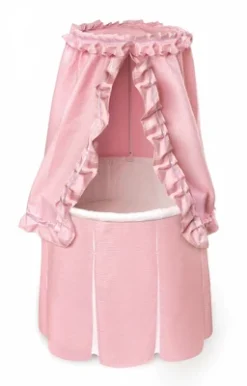Badger Basket’s Empress Round Baby Bassinet with Canopy is a lovely and unique sleeping place for Baby’s first few months! Comfortable for Baby and stylish for your home. Complete bedding set and foam mattress included. Floor-length skirt attached to the quilted interior liner. The skirt conceals the bassinet stand and hides the storage shelf. Ruffled, drape canopy flows down from the halo canopy frame at the top of the canopy pole. Canopy easily draws out of the way to tend to your precious bundle inside. Graceful canopy shades the interior to keep out harsh light while Baby is sleeping. Fitted sheet covers the custom fitted, vinyl-covered-foam mattress. Bassinet also includes locking caster wheels (never move the bassinet with your infant inside). Mesh storage shelf beneath the bassinet is handy for feeding and diaper changing necessities and toys. Use the bassinet with or without the canopy. Bassinet made with powder coated steel metal tubing, PP and ABS plastic, nylon, MDF, and PEVA (non-PVC) vinyl, and polyurethane foam. Bedding fabric is 100% Polyester. Overall unit measures 29.25 inches L x 29.25 inches W x 55 inches H. Generously sized interior measures 29 inches in diameter and is 8 inches deep. Bassinet base measures 21 inches L x 21 inches W x 19.5 inches H. Measures 30 inches from rim of bassinet to floor (25 inches from rim to top of canopy). Mesh shelf measures 20.5 inches L x 15.5 inches W with nine inches clearance between the shelf and bassinet bottom. Foam pad measures 28 inches in diameter x 1 inch H. Assembled product weight: 18 lbs. All measurements approximate. All bedding is machine washable (in cold water and gentle cycle). Tumble dry low, warm iron if needed. Adult assembly required. Illustrated instructions included. Bassinet is for use up to 20 lbs. (9.09 kg), 3-4 months, or until Baby can push up, roll over, or sit unassisted (whichever limit comes first). In order to comply with current safety standards, the mattress does not exceed 1 inch in thickness. Please assemble this bassinet in the room where you intend to use it unless your doorways are wider than 30 inches. Mesh shelf designed for lightweight items (up to 5 lbs. total). Additional fitted sheets sold separately in packages of two (Model #83998 White and Model #83997 Ecru). Product includes a limited warranty of 30 Days Parts to the original purchaser. Product details/features subject to change at any time without notice. Props/accessories shown are for illustration purposes only and are not included with the product. Actual color/finish may vary slightly from screen display. This item ships in its original carton that may include a product photo.