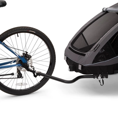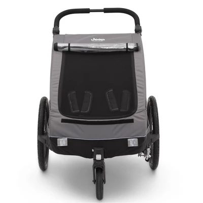 Take the whole family along for any adventure with the Jeep Everest 2-in-1 Bike Trailer and Stroller for 2 Kids by Delta Children. A durable bicycle trailer that easily transforms into a double stroller once you reach your destination, it provides a comfortable ride for two children. The included universal bike hitch easily attaches to most bicycles and the included stroller kit allows you to go from biking to strolling quickly by adding a front wheel. Designed to keep kids comfortable, the trailer features a large front mesh window, roll down rain shield and roll down windows on both side with mesh vents for airflow. An adjustable handlebar provides comfort for parents while in stroller mode and spacious rear cargo storage space can house frisbees, footballs, food—whatever your family needs while on the go. And when your outing is over, the compact, flat fold makes travel and storage easier than ever. For your safety, trailer includes safety flag, reflective piping, and two 5-point safety harnesses.