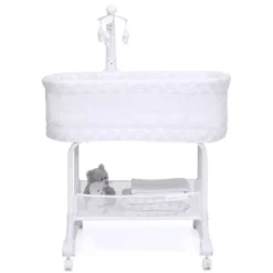 The SleepCool Rocking Bassinet by Delta Children has everything your baby needs to peacefully drift off to dreamland. The soothing rocking motion is activated by a gentle push while the breathable mesh sides allow air flow and visibility. And as your little one relaxes on the comfy mattress pad, they can look up at the mesmerizing overhead mobile with rotating plush stars. The mobile arm also features vibration, music, nature sounds, nightlight and twinkle lights. A dream come true for new parents, this bedside sleeper includes a machine washable bassinet sheet, large storage basket that keeps essentials close and wheels that make it easy to move. The modern pattern ensures this bassinet flawlessly coordinates with any décor. This bassinet is recommended for babies 0-5 months. Max weight 30 lbs. Stop use at 5 months or once your infant begins to push up on their hands and knees, whichever comes first.