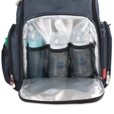 It’s great to be going places with baby, and this super-smart backpack makes it easy, fuss-free and fun. Fashioned of easy care fabric in gray or black, it features the Fastfinder Pocket System for maximum organization and a Super Cooler, so meals-on-the- go are a cinch. Ten pockets give you endless options for storage, including wipes pocket, paci pocket, diaper pocket, phone pocket, and a large insulated front compartment to hold 3 bottles/sippy cups. Changing pad and wipes case are included. For comfort’s sake, you’ll enjoy padded, adjustable shoulder straps, padded mesh back and a reinforced footed bottom.