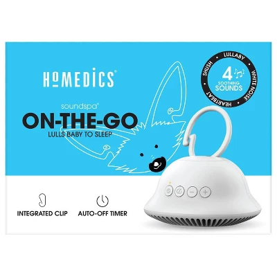 Nap time can be anytime with the HoMedics® SoundSpa® On-The-Go. Soothe your little one from anywhere with 4 calming sleep sounds including sush, heartbeat, lullaby, and white noise. Downward-facing speakers direct the sounds towards your baby for full immersion and a built-in carabiner easily clips onto car seats, strollers, diaper bags, and cribs for on-the-go or at-home use.