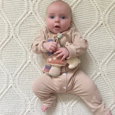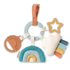 Teethe, Play & Explore! A sensory sensation, our Bitzy Busy Ring™ has all the love in the details with multiple features for baby to explore. Textured teethers and dangling toys that jingle, crinkle and delight – easily attach this toy to baby’s car seat or stroller for adventures ahead! Features natural cotton fabric and soft velour, two soft teethers and grasping star, a jingle bell, crinkle and ribbons.