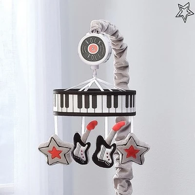 Two black, white, and gray velour guitars and two gray velour stars with black and red details circle around this unique musical crib mobile. The mobile ring is cleverly printed as a black and white piano keyboard. The scrunchie, which covers the mobile arm, is in gray velour and the music box is decorated with the words “Rock & Roll”. This battery-operated musical crib mobile plays nursery songs for 20 minutes, has an on/off switch, and volume control. It plays Brahm’s Lullaby, Twinkle, Twinkle Little Star, and Rock-a-Bye-Baby. Requires 3 AAA batteries not included.