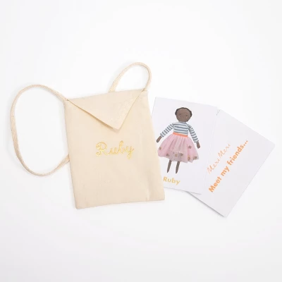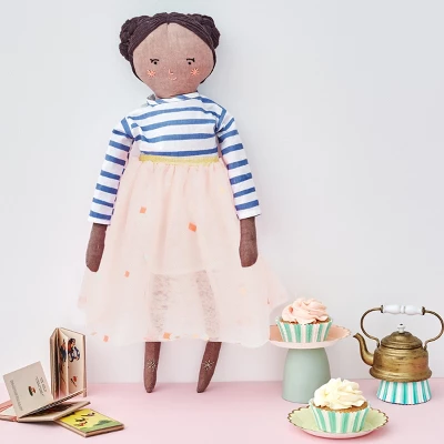 This is Ruby, one of the beautiful Meri Meri classic fabric doll family. Little ones will love to play with and cuddle her. She’s expertly crafted from calico, with plaited black woolen hair and sweet embroidered features. Wearing a gorgeous striped Breton top and pink netted tutu, she can also be undressed and re-outfitted for any occasion using any of our dress-up kits. She also comes with a delightful fact card, in a lovely cotton bag with her name in shiny gold letters, which lists her favorite things and her best friend.