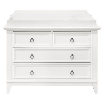 The Emma Regency Removable Changing Tray is the perfect functional accompaniment to the Emma Regency 4-Drawer Dresser. Featuring three compartments with a bold geometric styled back panel, this changing tray is the stylish accessory to seamlessly convert your baby’s dresser into a changing station that keeps all necessities at hand. The changing tray securely affixes to your Million Dollar Baby Classic double-wide dresser with safety brackets that are concealed in the back of the dresser. Once you are out of the diaper-changing stage, the tray can be easily removed to allow your dresser to grow with your child.