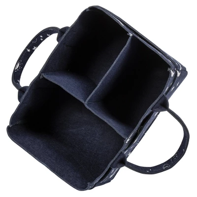 Our soft & sturdy Constellation Felt Storage Caddy is designed to keep diapers, wipes and changing items organized. Sturdy felt handles allow the caddy to be easily moved from room to room. The body and handles feature a silver constellation pattern printed on a navy blue felt with a navy blue interior.The Storage Caddy also functions as an essential organizer for hair products, crafts, office and pet supplies, automotive and other necessities. Coordinating accessories and room décor by Sammy and Lou are available and sold separately.