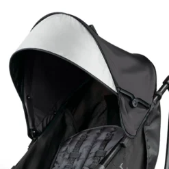 - INCLUDES: Cup holder, Rear storage pocket, Carry strap, 5-point safety harness, Large storage basket, Adjustable and removable canopy with flip-out sun visor