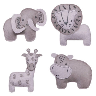 Encourage eye tracking and sound perception skills with the Sydney Musical Mobile by Trend Lab. Wide banded mobile ring features a gray dalmatian dot print with a solid gray trim. Slide cover is coordinating solid white. An adorable felt giraffe, elephant, lion and hippo in shades of gray are suspended from decorative white ribbon and slowly rotate to Brahms’ Lullaby. Mobile easily attaches to most cribs. Mobile measures approximately 24 in tall by 20 in wide. This mobile coordinates with the Sydney collection by Trend Lab. Possible entanglement injury. Keep toy out of baby’s reach. Remove mobile from crib or playpen when baby begins to push up on hands and knees.